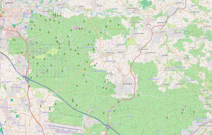 Übersichtsplan der im Bildband aufgeführten Flurdenkmale und Gedenksteine im Sebalder Reichswald. Zum besseren Auffinden habe ich die einzelnen Flurdenkmale und Gedenksteine mit den entsprechenden Koordinaten versehen.