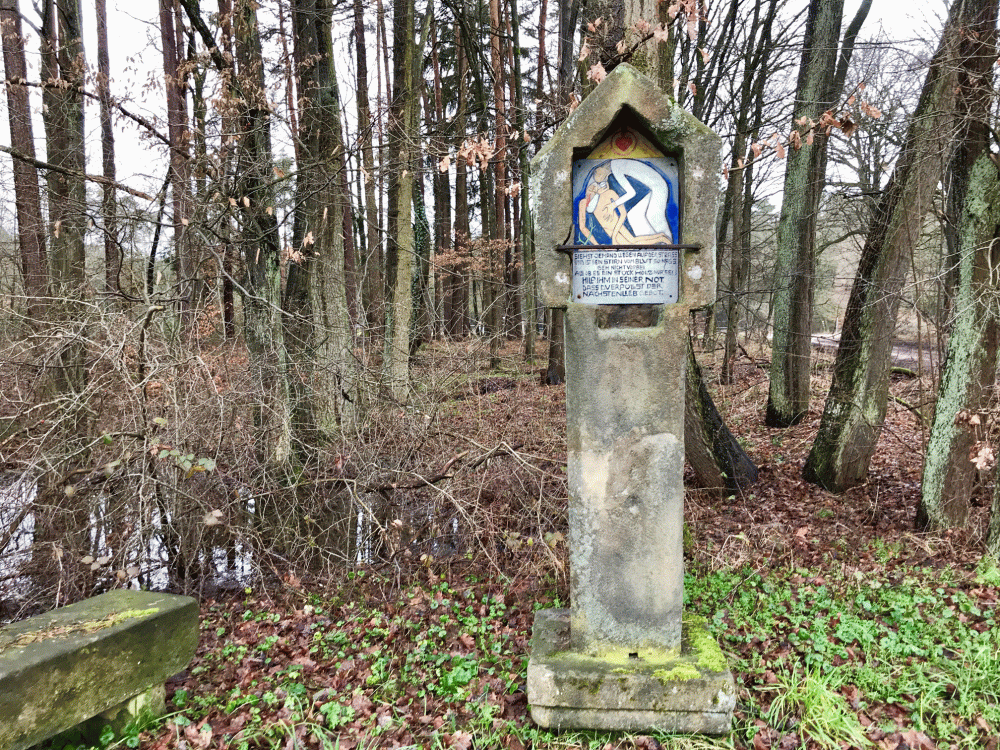 Honings I: auf dem eingelassenen Blechschild ist folgendes zu lesen: „Siehst jemand liegen auf der Strass und ist sein Stirn vom Blut so nass, geh nicht vorbei als ob es ein Stück Holz nur sei! Hilf ihm in seiner Not, dass du erfüllst der Nächstenlieb Gebot“