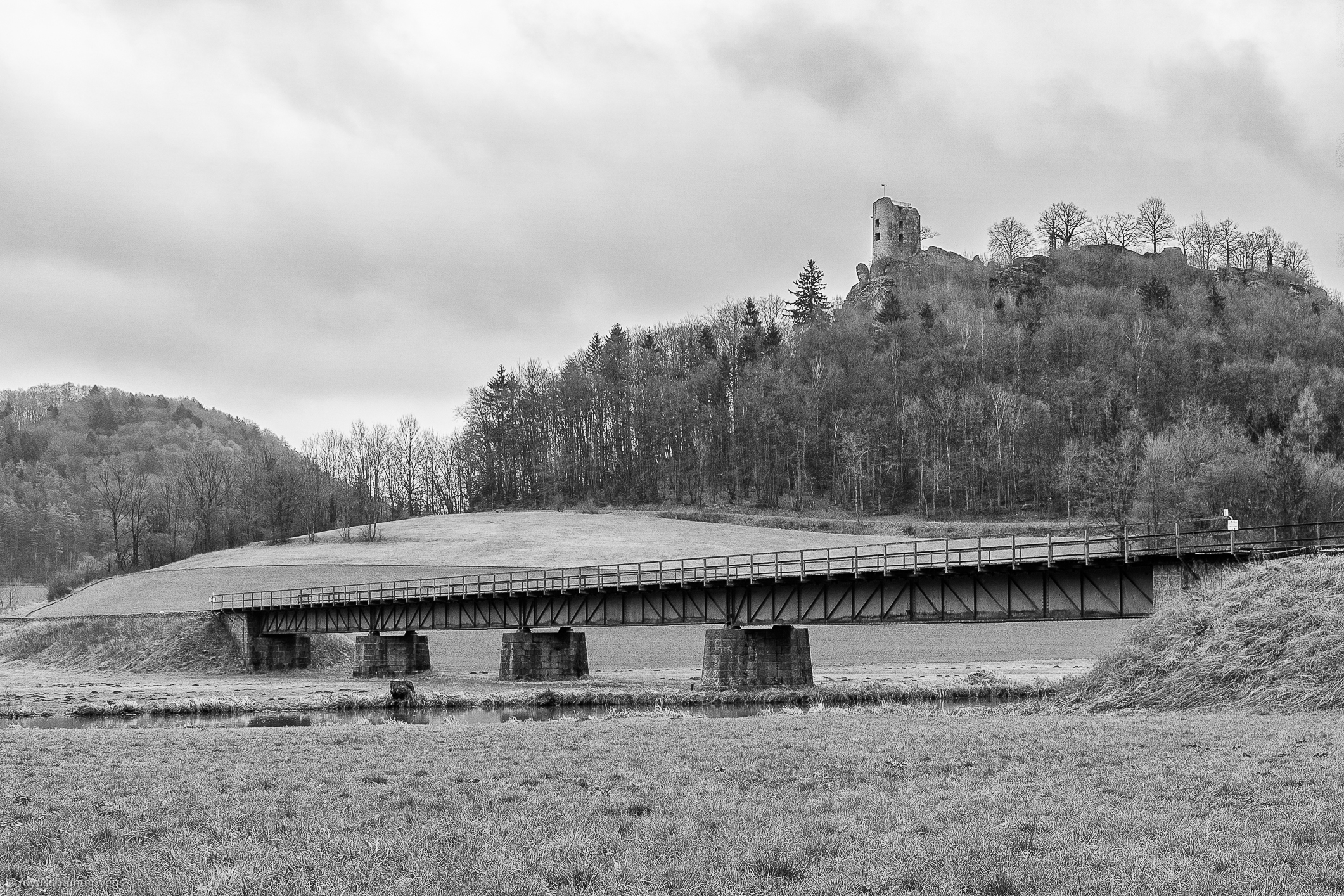 Das heutige Foto stammt von einer Radtour, die ich vor geraumer gemacht hatte. Es zeigt die Eisenbahnbrücke über die Wiesent mit Burgruine Neideck im Hintergrund.
