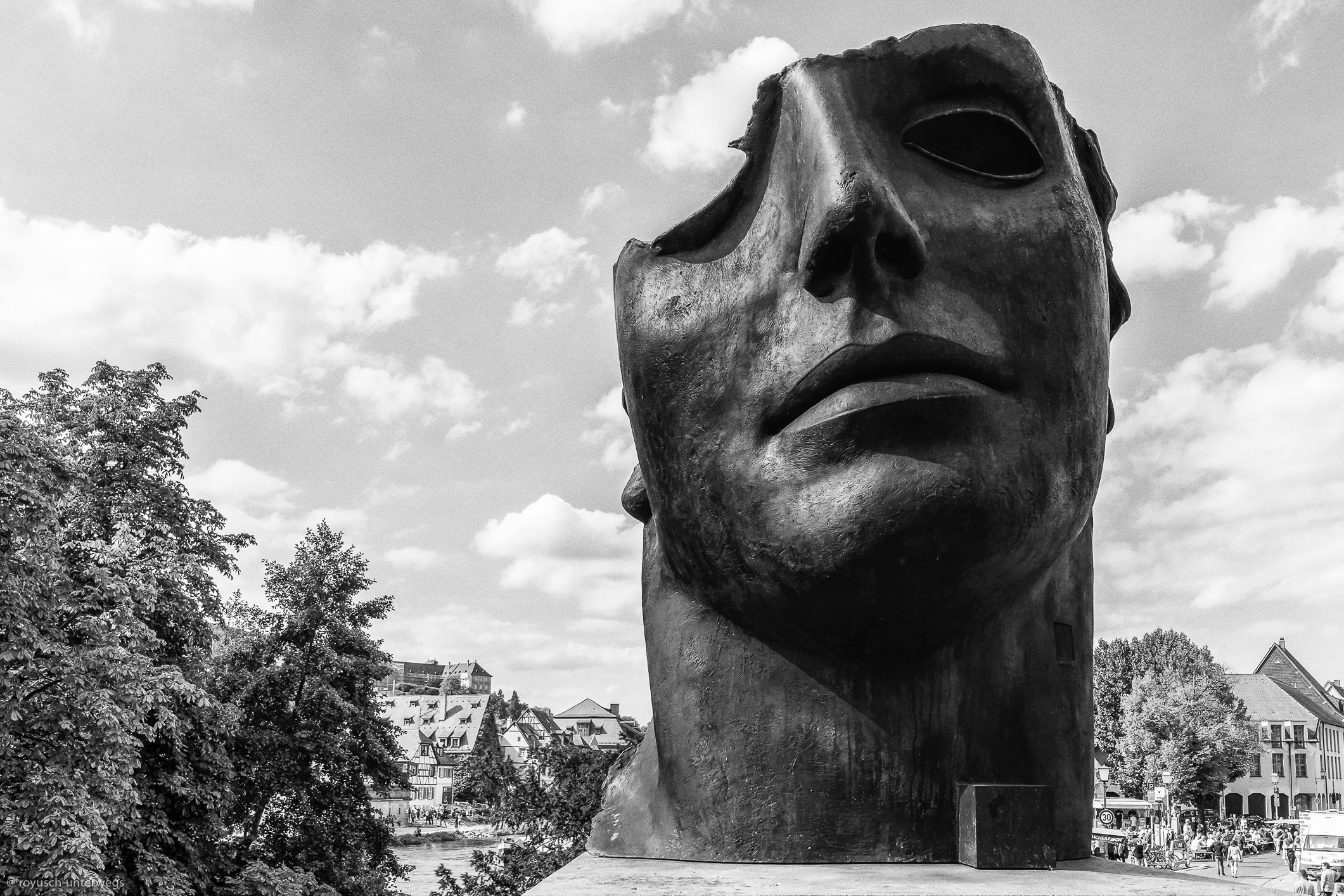 Das heutige Bild zeigt die Bronzeplastik Centurione I und ist ein Werk des polnischen Künstlers Igor Mitoraj aus dem Jahr 1987. Sie steht auf der Aussichtsterrasse der Unteren Brücke nahe des Hochzeitshauses, des Alten Schlachthofs und des Alten Rathauses in Bamberg.
