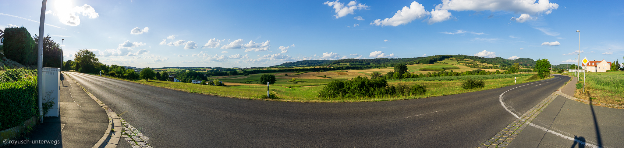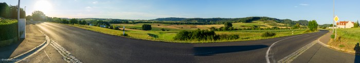 Es geht um die Krümmung des Vordergrundes in einem Panorama-Bild. Hier habe ich drei Panorama-Bilder, die exakt an der gleichen Stelle aufgenommen wurden. Im Vordergrund verläuft eine gradlinige Straße, die ich ganz bewusst mit ins Bild bringen wollte, um die Krümmung dazustellen.