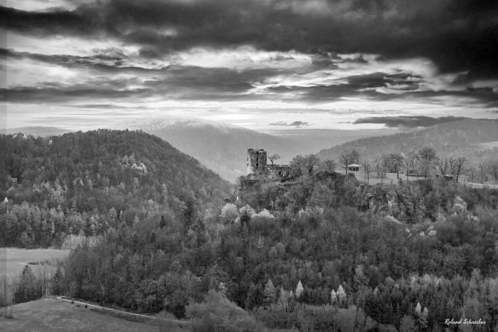 Zum Abschluss meiner kleine SW-Serie zur Burgruine Neideck im Wiesenttal, noch mal ein Bild, das ich „nebeliger Sonnenaufgang“ genannt habe.