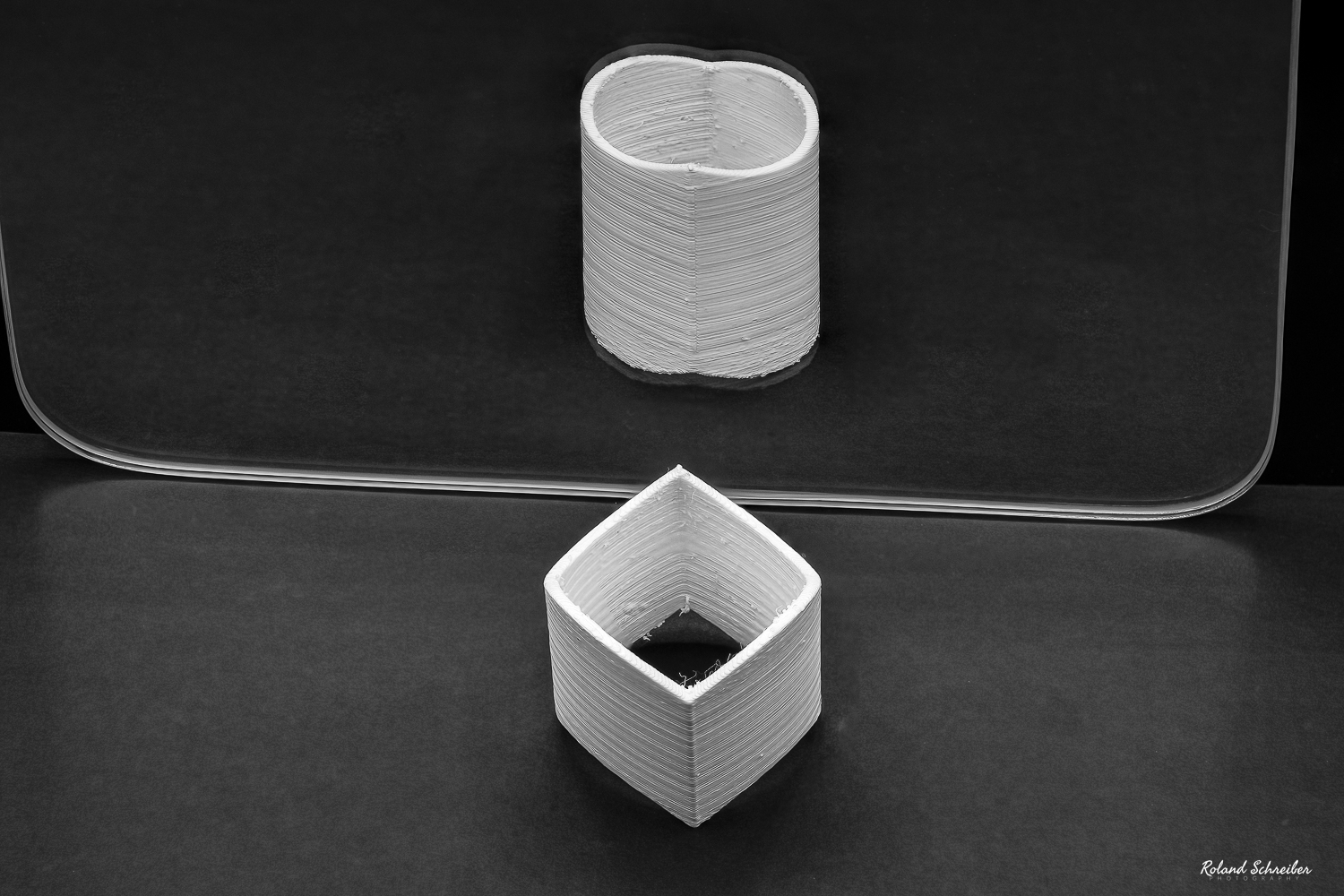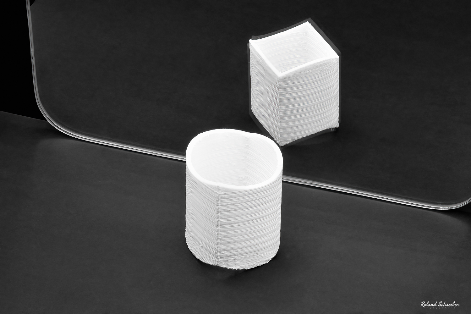 Bei den ersten Bilder musste ich feststellen, dass der Zylinder im Vordergrund zwar scharf wurde, aber das Spiegelbild überhaupt nicht. So habe ich mich entschieden, Einzelaufnahmen zu machen (pro Bild etwa 40 Stück) und diese habe ich dann in Photoshop zusammen gesetzt, in schwarzweiß konvertiert und einen kleinen Verlaufsfilter draufgelegt. Ich muss sagen, mit dem Ergebnis bin ich doch sehr zufrieden. Experiment gelungen 👏