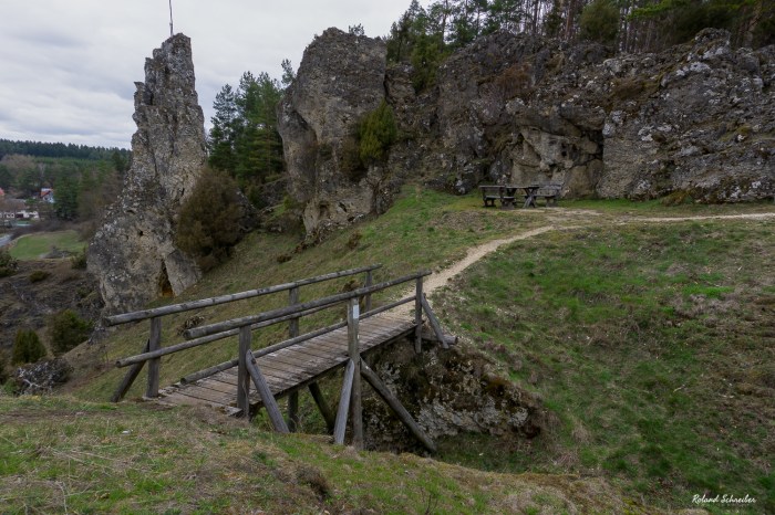 Von hieraus überquert man die Straße und folgt dem gegenüberliegenden, ansteigenden Wanderweg. Rechts und links des Weges befinden sich die Fuchsbauten, die Bauernhöhle, die Rauenberger Höhle und der Krämerstein.