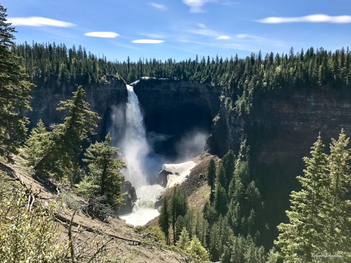 Zum Pflichtprogramm gehören natürlich die Helmcken Falls. Das war schon beeindruckend zu sehen und zu hören. Mit was für einer Kraft das Wasser herunter stürzt! Hinter dem Wasserfall verbirgt sich eine riesige Höhle, in der noch jede Menge Schnee lag.