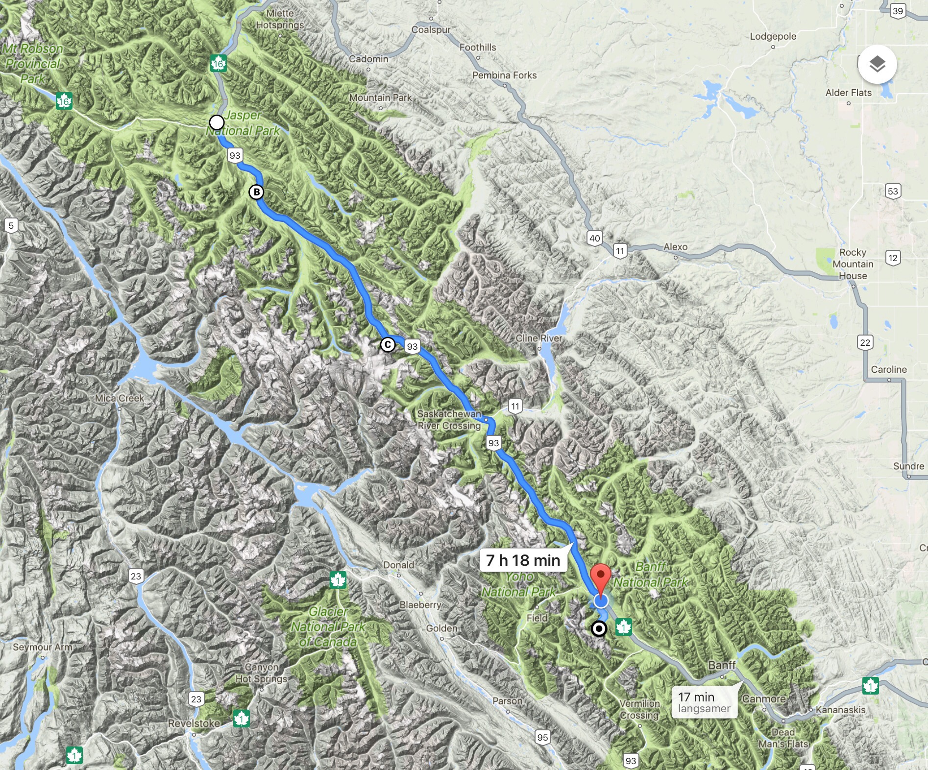 Die heutige Strecke von Jasper nach Lake Louise mit 220 km, wäre sicherlich in 3 – 3.5 Stunden erledigt gewesen, wären da nicht die etliche Stopps 🙂 und die diversen 60 km/h Begrenzungszonen. Wer also über den Icefield Hwy fährt, ob von Süden nach Norden oder umgekehrt, sollte jede Menge Zeit einplanen, es lohnt sich.