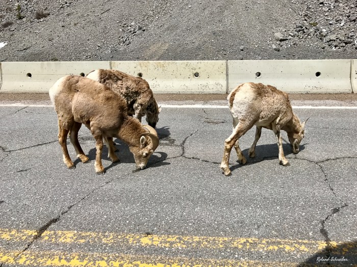 Den Ausflug mit den Spezialbussen, mit den mannshohen Reifen, wäre sicher interessant gewesen, haben wir uns dann aber aus Zeitgründen gespart. So ging es weiter, bis plötzlich die Straße durch Bighorn sheep blockiert wurde. Die waren dabei, dass Salz von der Strasse zu lecken. Auch die ließen sich überhaupt nicht stören. Der Autoverkehr musste sich einfach die andere Straßenhälfte teilen.