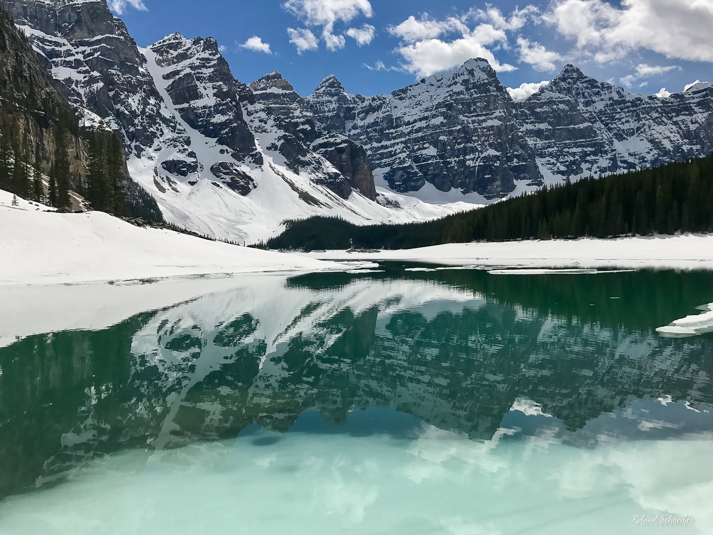 In Lake Louise wollten wir uns noch zwei Highlights anschauen, den Moraine Lake und den Lake Louise. Aber vorher erst mal auf dem Campground einchecken. Wie sich herausstellte, war das garnicht nötig, da auch hier nichts los war. Aber sicher ist sicher, man kann ja nie wissen. Danach nichts wie ab zum Moraine Lake, das Wetter war gerade günstig. Dort angekommen, mussten wir auch hier feststellen, dass er noch mit Schnee und Eis bedeckt ist. Das konnte man schon erahnen, da bei der Anfahrt, links und rechts noch jede Menge Schnee lag, ich würde mal sagen, locker bis zu einem Meter hoch. Aber auch mit Schnee und Eis lohnt sich ein Besuch.