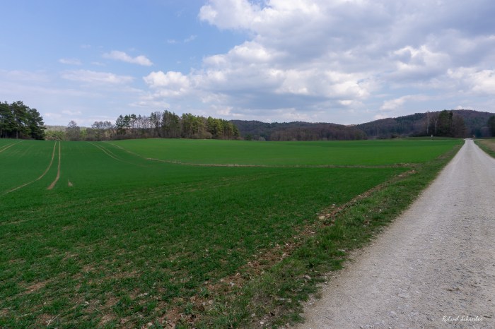 Von hier aus leitet die Markierung „Blaustrich“ abwärts bis zum Abzweig Richtung Simmelsdorf. Weiter geht es auf gut ausgebauten Flurwegen über den Görbitzer Steig durch Feld und Wald bis zur Ortsverbindungsstraße Wölfersdorf-Kemmathen. Der „Rotpunkt“ führt nach Wölfersdorf hinein. Hier gibt es im Sommer einen gut besuchten, familienfreundlichen Biergarten.