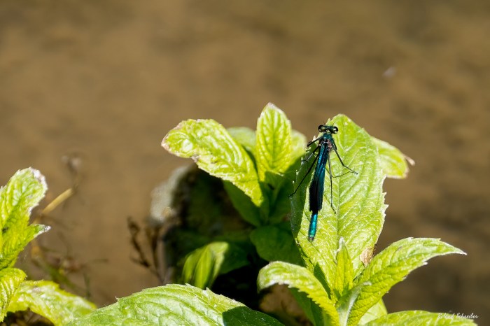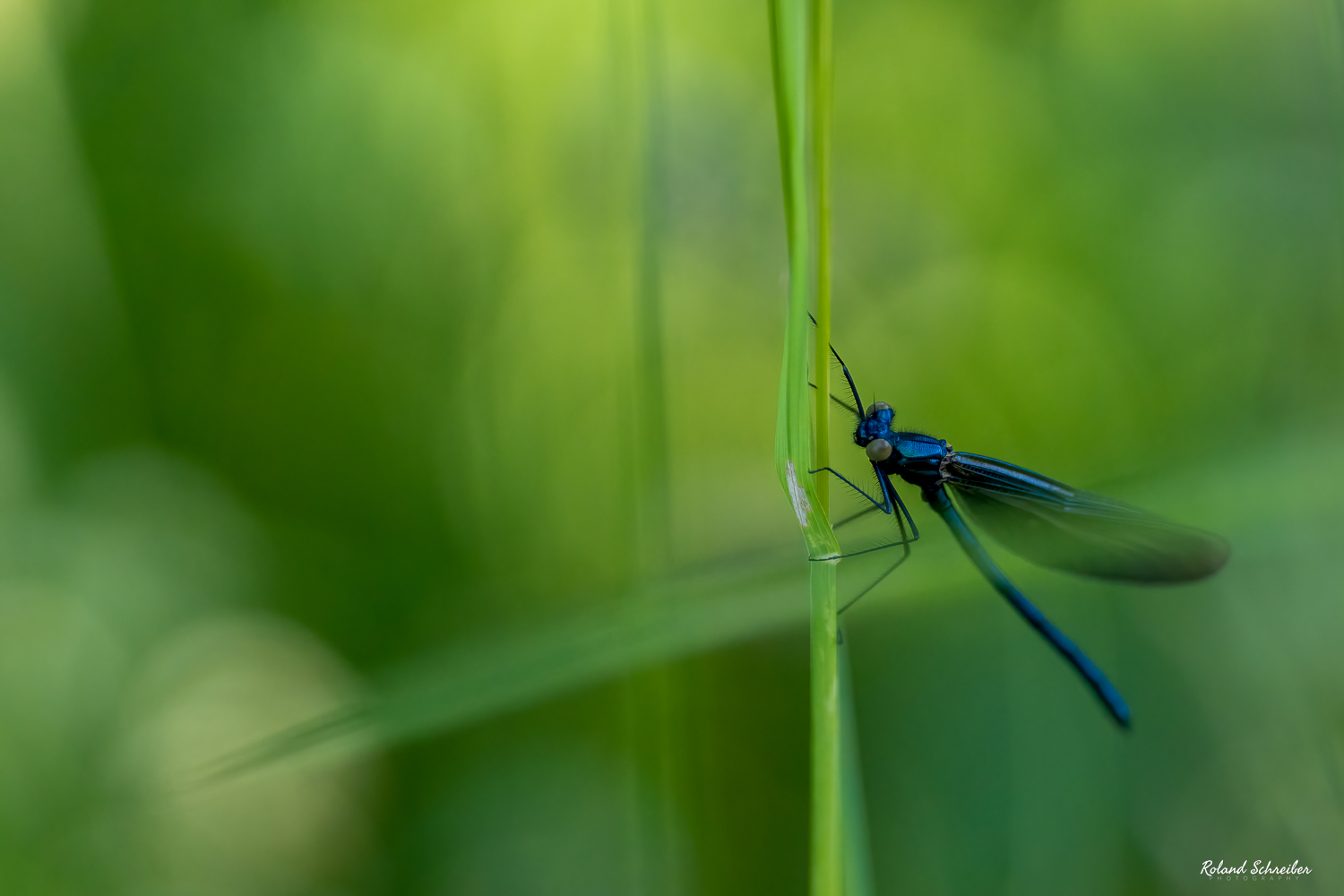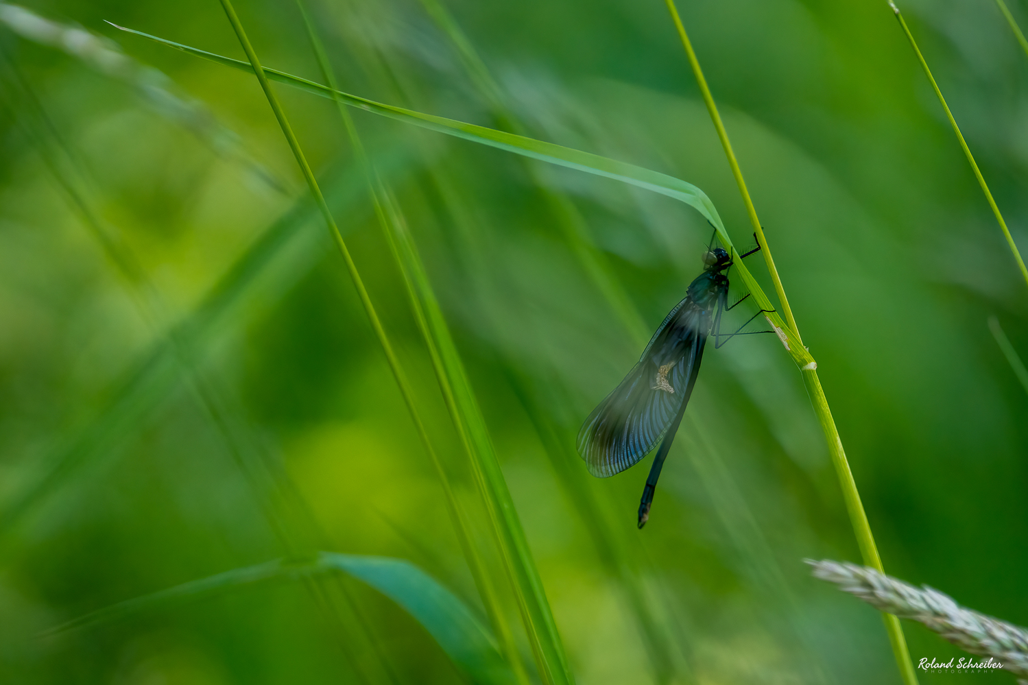 Wenn ich richtig recherchiert habe, handelt es sich hier um ein Männchen der Gebänderte Prachtlibelle. Sie ist eine Libellenart aus der Familie der Prachtlibellen und bewohnen langsam fließende Bäche, kleinere Flüsse und krautreiche Kanäle, die nicht zu sehr verschmutzt sind sowie ausreichend besonnt werden. (Quelle: Wikipedia)