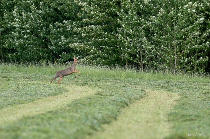 Ein wirklich sehr schönes Fotohighlight ist dieses so dynamisch springende Reh auf der frisch gemähten Wiese, lieber Roland! Zum Glück werden unsere Felder inzwischen ja vor dem mähen teils mit Drohnen und auch von den Bauern nach versteckten Kitzen abgesucht, weshalb dieser Rehsprung auch mit Freude anzuschauen ist! 😉