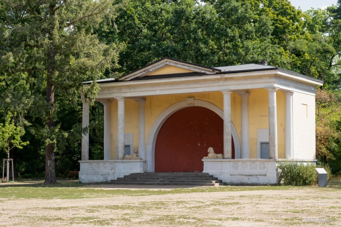 „Unter den Blicken der mythischen Sphingen“ …der Musikpavillon (auch Musikmuschel genannt) an der Festwiese ist ein typischer Bau für „gesellschaftliche Vergnügungen“, wie es damals hieß.