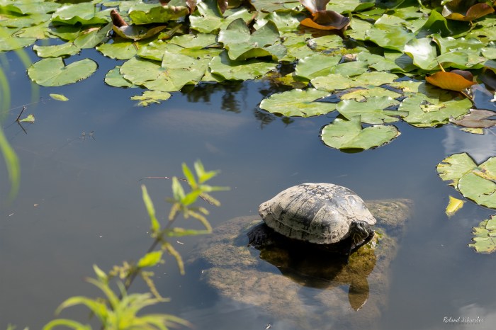 Ob es sich bei dieser Wasserschildkröte um das Maskottchen des Hainweihers handelt, kann ich nicht sagen, aber ich war sehr erfreut, dass sie sich nicht durch meine Anwesenheit bei ihrem Sonnenbad gestört fühlte.