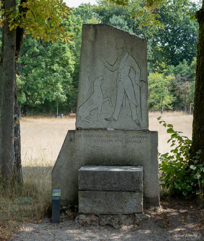 „Auf diesem Wege begegnete E.T.A. Hoffmann dem redenden Hund Berganza.“ So steht es seit 1968 in Stein gehauen geschrieben. Zu sehen am westlichen Rand der Schillerwiese. Durch seinen gut sechsjährigen Aufenthalt von 1808 bis 1813 in Bamberg erhielt der in Königsberg geborene Jurist und Beamte, später als Literat, Kapellmeister, Komponist, Musiklehrer, Karikaturist und Maler gehuldigt, postum von der Stadt Bamberg einen gehobenen Status, den er wahrscheinlich selbst verhöhnen würde! Wenn auch seine Lebensphase in der Bischofsstadt eine prägende Auswirkung auf sein literarisches Schaffen hatte, war es die Zeit des „persönlichen Scheiterns“, wie er vermeldete.