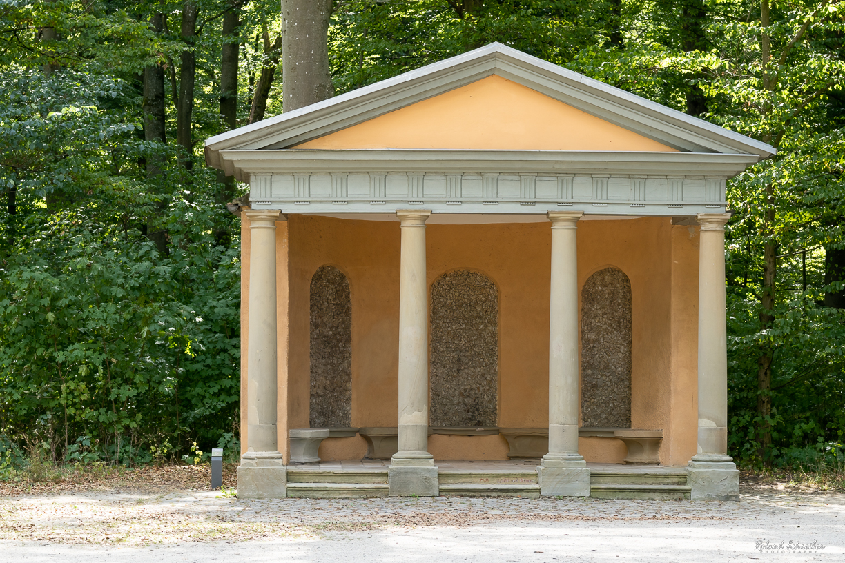 Die 1808 errichtete Kurhalle (auch Ruhetempel) bekam im Januar 2018 einen „Dachschaden“. Ein Windbruch durch Sturmtief „Friederike“ hatte ihn verursacht. Die Reparatur ließ auf sich warten, wurde dann aber Ende Oktober 2019 abgeschlossen. Als „Belvedere“ befindet sich der Pavillon – nach seinem Umzug 1910, „verdrängt“ durch das Denkmal Ludwig II. – am südlichen Rand der Schillerwiese und stammt – vermutlich – wie der Monopteros aus dem Park von Schloss Seehof.