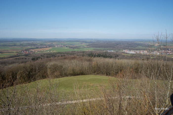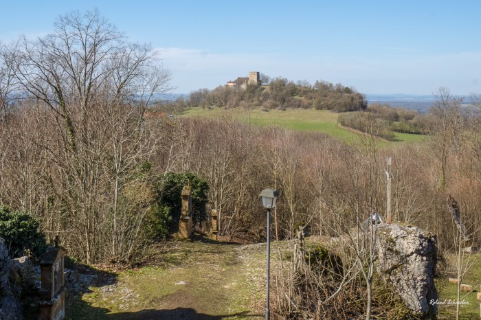 Aber zuerst hatten wir einen kleinen Stop bei der „Burg Gügel“ eingelegt. Die Burg Gügel ist eine abgegangene Gipfelburg auf dem 515 Meter hohen „Gügel“ Sie wurde erstmals 1274 mit einer Kapelle zu Ehren des heiligen Pankratius urkundlich erwähnt. Die Burg selbst wurde um 1348 – 1421 zerstört. Heute befindet sich dort eine Wallfahrtskirche, die leider geschlossen war. Gerne hätte ich mal einen Blick hineingeworfen. Dafür hat man aber einen herrlichen Blick hinüber zur Giechburg, unseren eigentlichen Ziel.