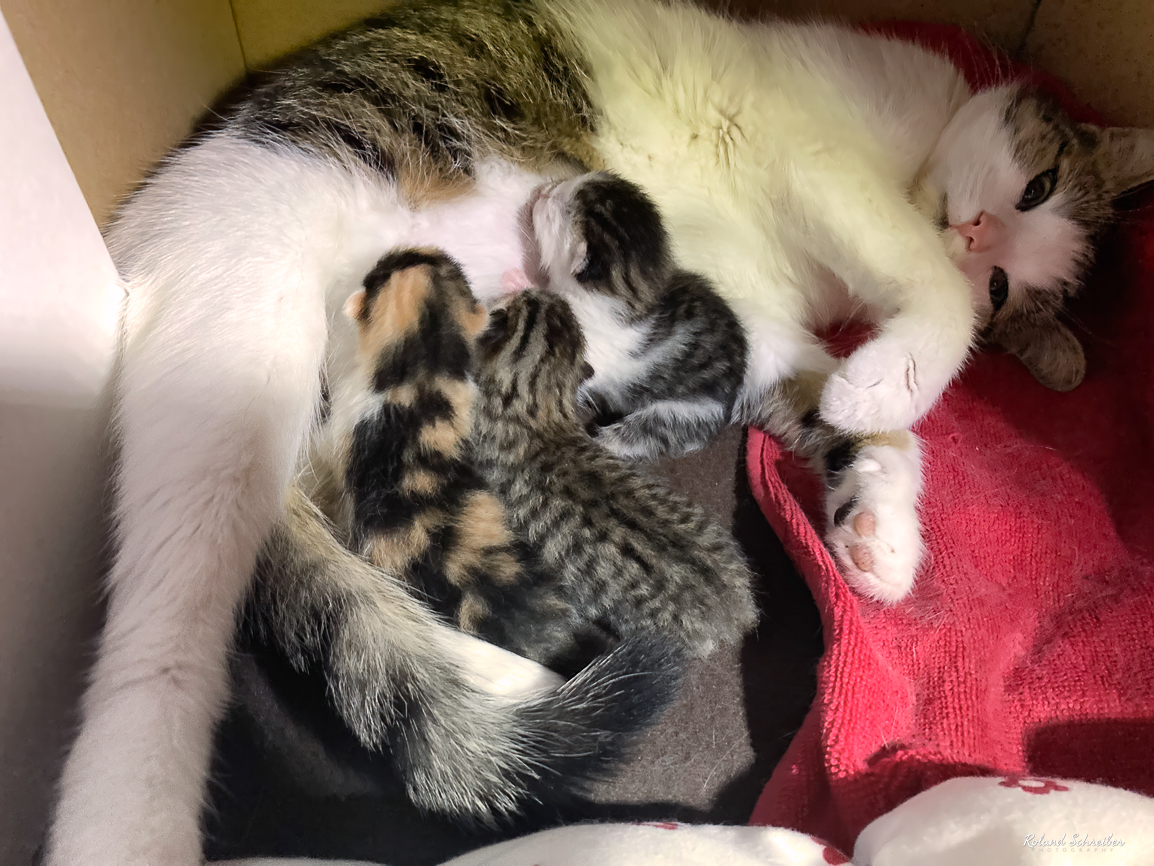 16. Ach, wie ist das herzig! Und so schön anzuhören, wie wonnig die frisch gebackene Katzenmama vor sich hin schnurrt. Alles Gute und Liebe der kleinen Familie. ❤