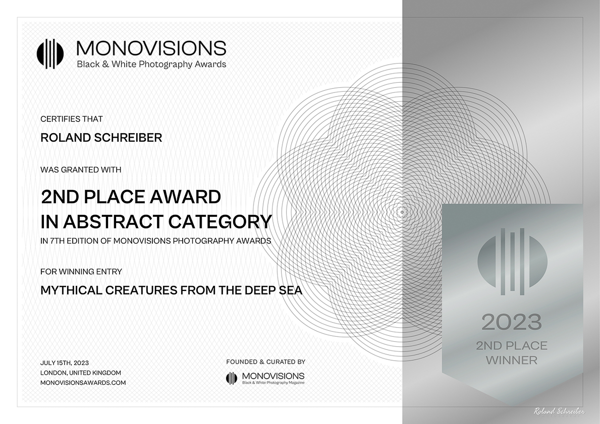 Unter der Kategorie „Serie Abstract“ habe ich meine kleine Bilderserie eingereicht und heute, völlig überraschend, eine Benachrichtigung bekommen, das ich den zweiten Platz „IN 7TH EDITION OF MONOVISION PHOTOGRAPHY AWARDS“ mit meinen „MYTHICAL CREATURES FROM THE DEEP SEA“ in der „ABSTRACT CATEGORY“ gewonnen habe. Wow, was für eine tolle Überraschung!!!