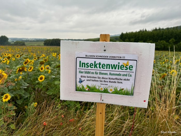 Dieses Schild gilt wahrscheinlich nur für die bestimmt schöne angelegte Blumenwiese neben dem Sonnenblumenfeld, denke ich und finde ich auch gut so.