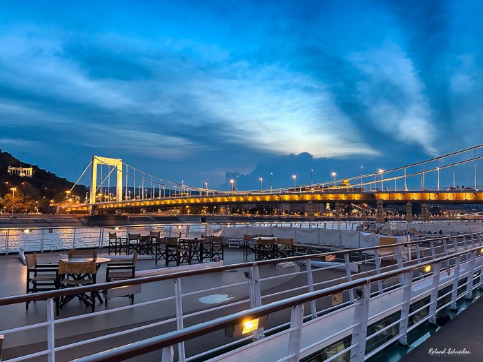 Wieder auf dem Schiff zurück, haben wir den Tag in aller Ruhe ausklingen lassen. Erst das Abendessen, dann ein wenig Ruhe auf dem Sonnendeck mit der Aussicht auf Teile des beleuchteten Budapest.