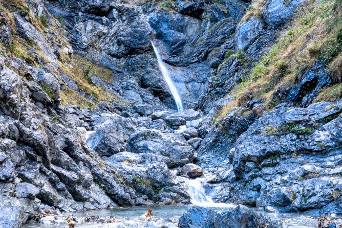 Kann es sein, dass in diesem Enger-Grund-Bach nur sehr wenig Wasser war, denn sieht auf dem Bild danach aus? Aber egal, denn der Weg zum Ziel am Bach entlang war offensichtlich sehr schön und dann dieser herrliche Wasserfall als Highlight des Tages…. Was brauchts da mehr.