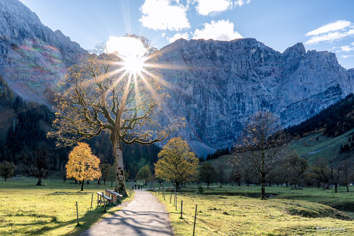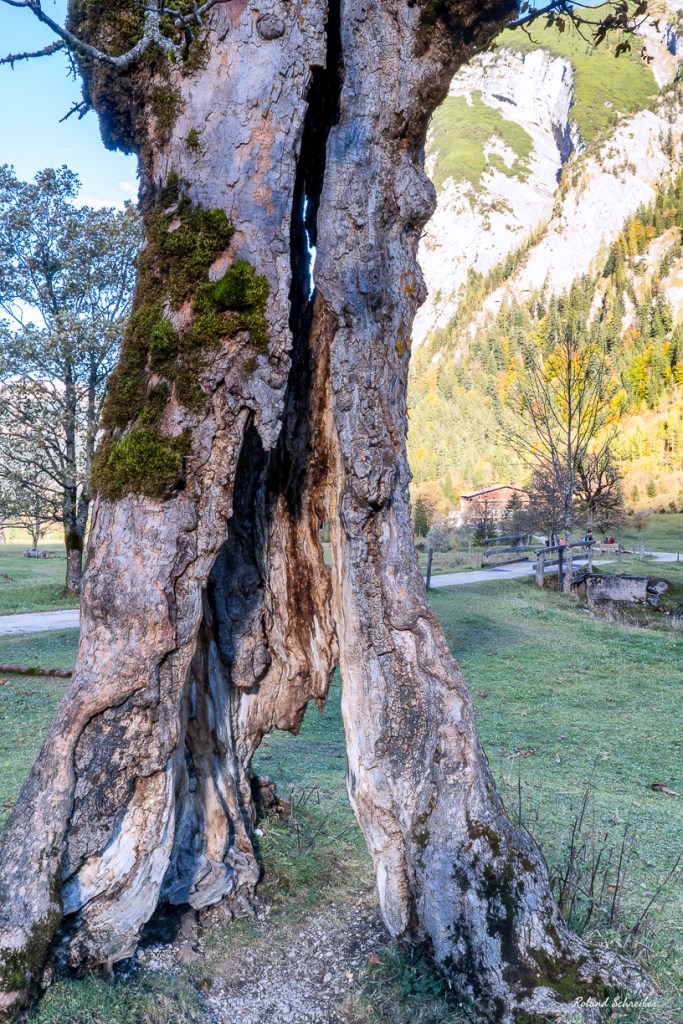 Das wunderschöne Foto mit den Sonnenstrahlen vor dem Bergmassiv gefällt mir gerade am besten und dieser uralte gespaltene Ahornbaum war wahrscheinlich inzwischen Totholz für die winzigen Tierchen.