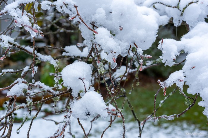 1. Freute mich gestern auch über diesen über Nacht entstandenen wunderschönen winterlichen Anblick im Garten und letzte Nacht kam noch etwas bereits geschmolzene Stellen wieder überdeckender, etwas leichterer weil nicht so nasser „Puderzucker“ hinzu.