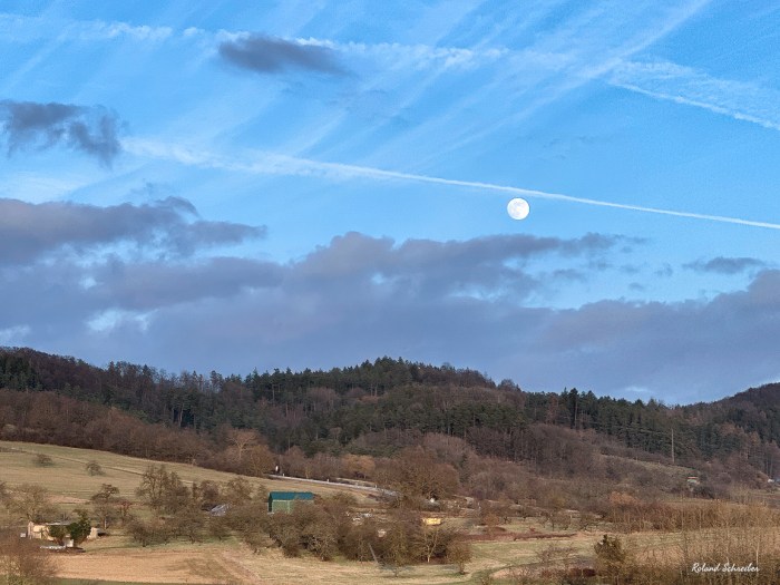 Kaum hatte ich das freie Feld vor mir, kam das aha Erlebnis. Auf der einen Seite der aufgehende Mond und auf der anderen Seite die untergehende Sonne. Diese Anblicke musste ich einfach genießen und bin doch, trotz Sturm meine gesamte Runde gelaufen. Es war einfach herrlich Sonne und Mond zu bestaunen.