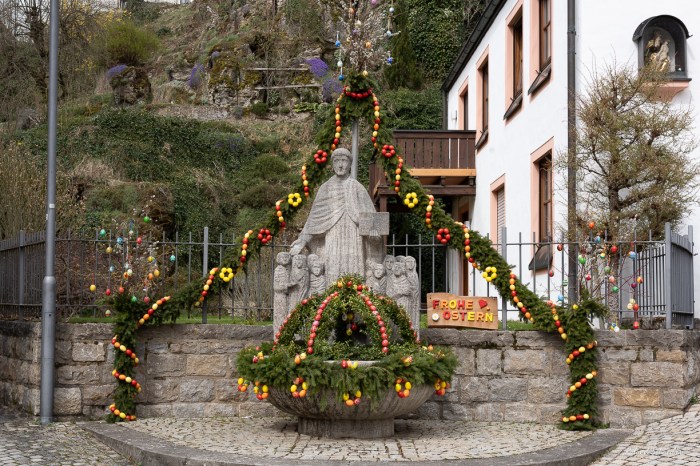 Die fränkischen Osterbrunnen sind gar herrliche und prachtvolle Schmuckstücke! Vor einigen Tagen kam in der BR-Rundschau ein kleiner TV-Beitrag darüber, und ich habe jeden Augenblick genossen. Vor einigen Jahren hat mich eine liebe Mitbloggerin mal in ihre fränkische Heimat mitgenommen, da waren auch viele schöne Osterbrunnen zu sehen.