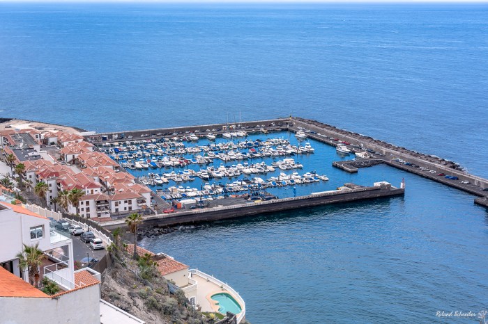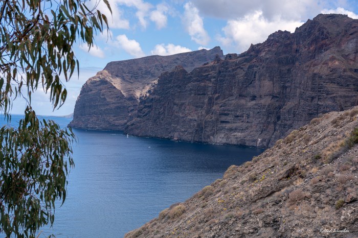 Dann kam die Ausfahrt, die uns direkt nach Los Gigantes führen sollte. Alles prima, Los Gigantes war auch schnell erreicht; aber dann ging es los. Kleine überfüllte Straßen, viele, viele Touristen, einmal falsch abgebogen und schon gab es eine extra Runde. Ich glaube, ich habe vier oder fünf Runden gedreht, bis ich endlich die richtige Straße zum Mirador Archipenque gefunden hatte. Aber auch hier sah es mit Parkplätzen nicht sehr rosig aus. Wir hatten Glück und fanden kurz vor Ende der Straße einen Parkplatz und konnten so die herrliche Aussicht auf die Felswände Acantilados de los Gigantes und den Hafen genießen.