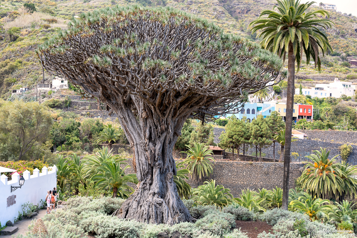 Weil Drachenbäume sich mit dem Wachstum viel Zeit lassen und erst nach ein paar Generationen urig werden, wurde ihnen immer wieder ein biblisches Alter angedichtet. Früher behauptete man, dass der Drago in Icod 3.000 Jahre alt wäre und er den Beiname „Milenario“ zu recht tragen würde, aber zwischenzeitlich wurde wissenschaftlich nachgewiesen, dass er zwischen 600 – 800 Jahre alt ist. Ich meine, dass ist schon sehr beeindruckend, zu mal er eine Höhe von 16 m und einen Stammumfang von 6 m hat. Bei dem folgenden Bild, habe ich die Personen (links im Bild) bewusst dagelassen, um das Verhältnis Mensch und Baum zu zeigen.