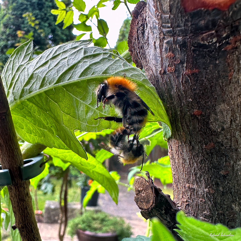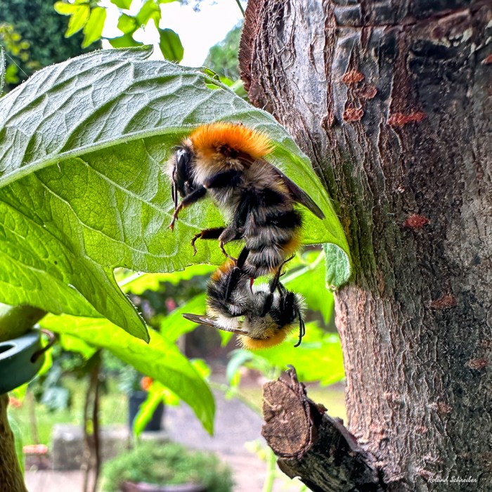 Heute morgen sah ich eine Hummel an einer unserer Tomatenpflanze. Irgendwie sah sie aber komisch aus. Beim genaueren Hinschauen, konnte ich einen seltenen Naturmoment erleben; zwei Hummeln bei der Paarung. So etwas hatte ich noch nie zuvor gesehen. Das die Kamera nicht mehr still stand, könnt ihr euch sicher vorstellen.
