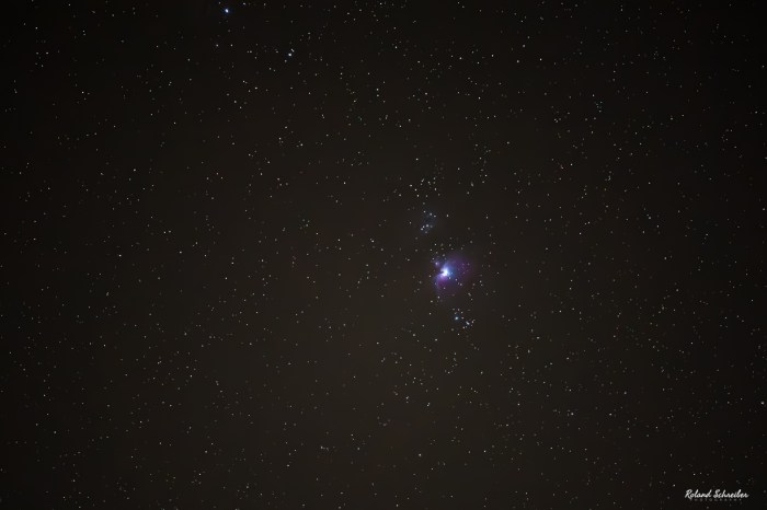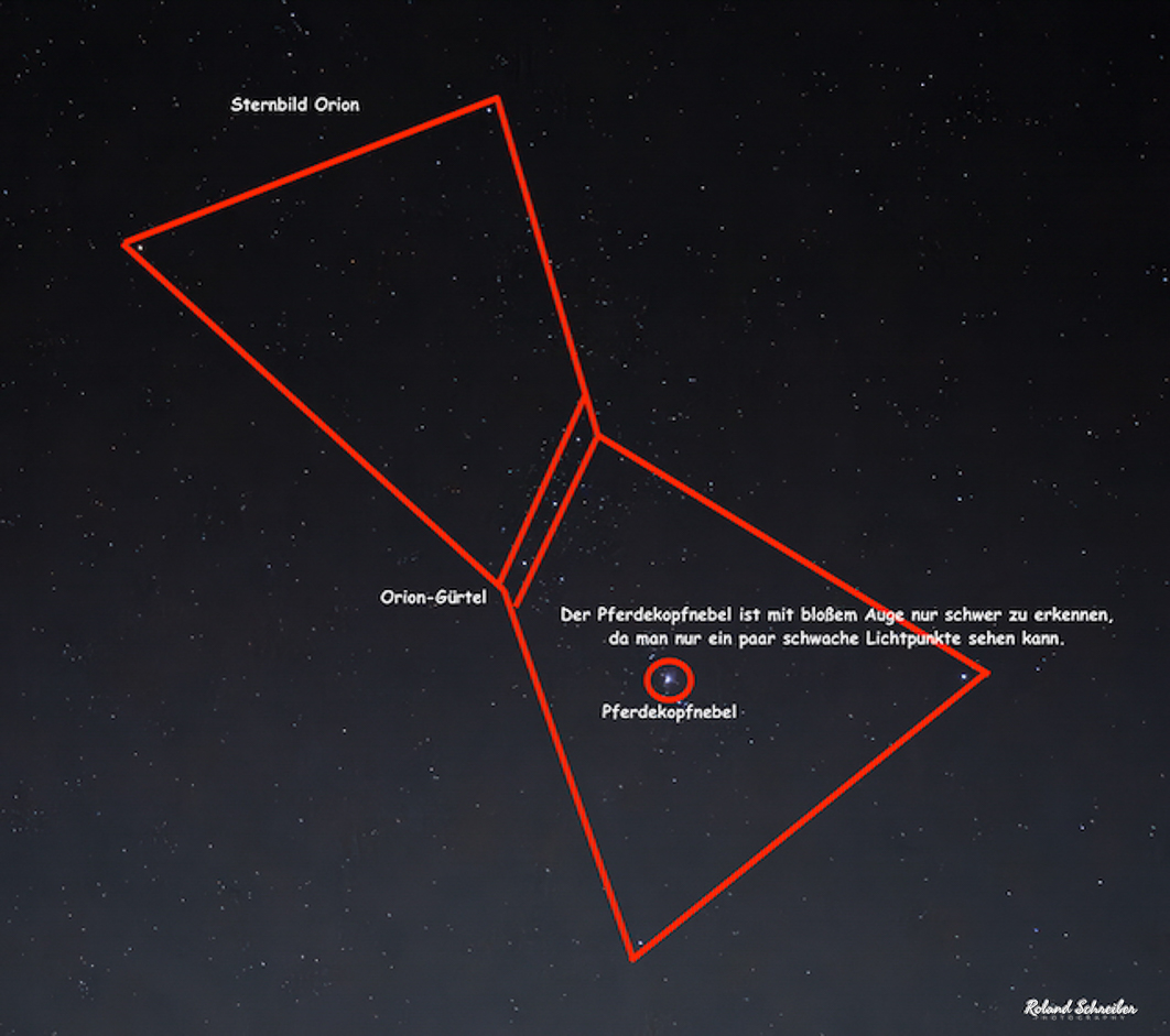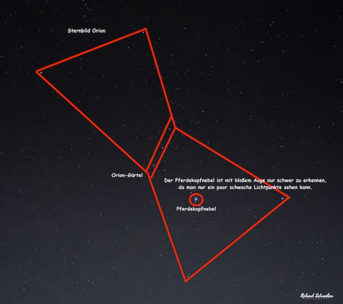 Der Orionnebel liegt unterhalb des Orion-Gürtels. Bitte den „Pferdekopfnebel“ gedanklich mit dem Orionnebel tauschen.