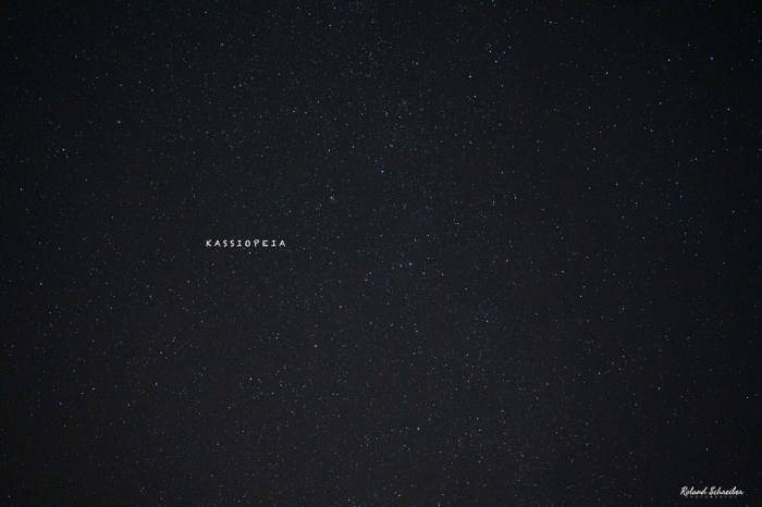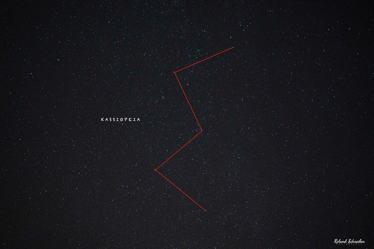 Ja, und war dann da noch das Sternbild Kassiopeia. Die fünf Hauptsterne der Kassiopeia bilden ein markantes W oder M am Himmel, weshalb auch von Himmels-W bzw. Himmels-M gesprochen wird. Die Spitze in der Mitte dieses Sternenzuges zeigt in Richtung des Nordpolarsterns.