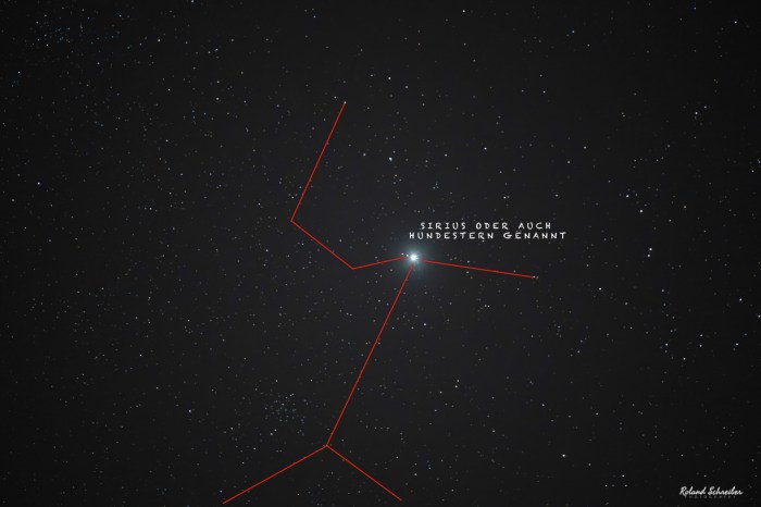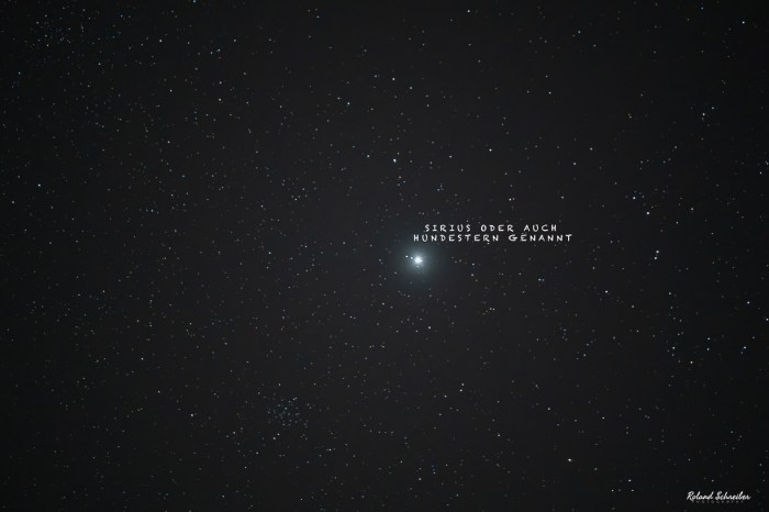 Den ersten Stern, den ich schon seit längerem im Auge hatte, war der Sirius oder auch Hundsstern genannt. Das Sternbild „Großer Hund“ besteht aus acht Sternen, deren hellster der Stern Sirius ist; er trägt deshalb auch den Beinamen „Hundsstern“. Der Sirius, sein Name bedeutet in etwa „der Gleißende“, hatte in vielen alten Hochkulturen eine besondere Bedeutung.