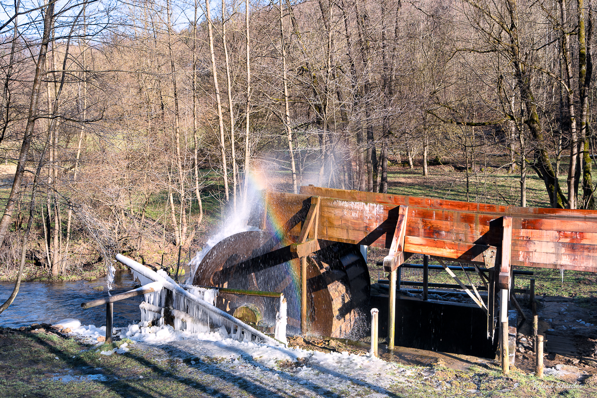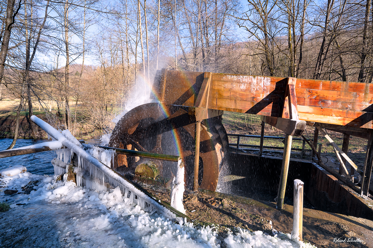 Umso schöner war es dann gestern, Wasserrad teilweise vereist, aber was noch viel schöner war, war der Regenbogen, der sich in der Gischt bildete. Da hatte ich doch Glück, genau zur richtigen Zeit am richtigen Ort gewesen zu sein.