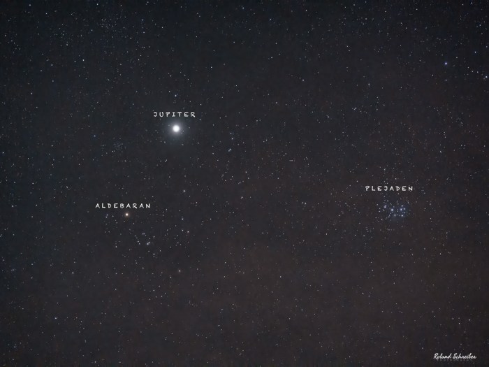 Jupiter, Aldebaran und die Pljaden am leicht bewölkten Abendhimmel.