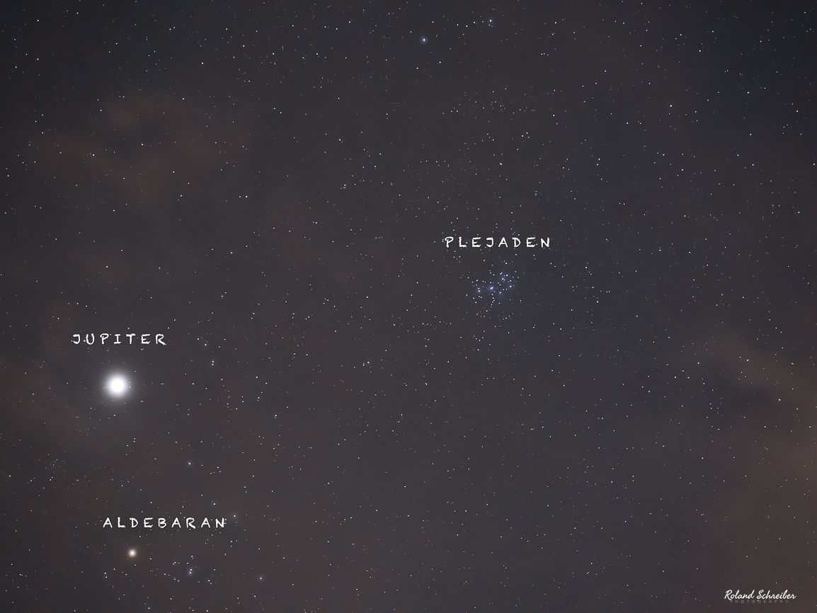 Jupiter, Aldebaran und die Pljaden am leicht bewölkten Abendhimmel.