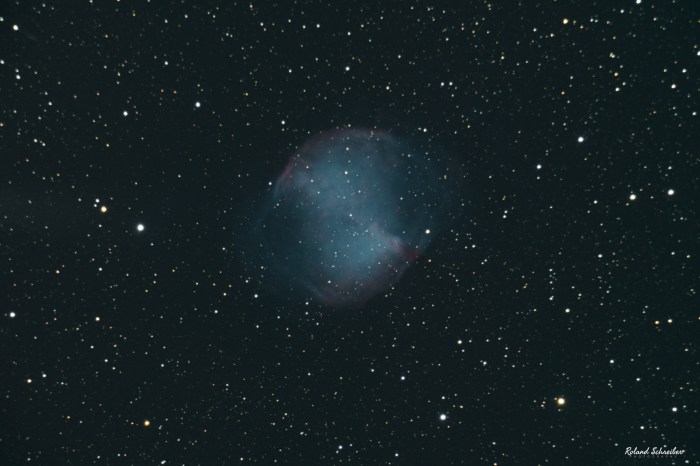 Lieber Roland, dieses Bild vom Hantelnebel ist der absolute Hammer. Zumal sich dieser planetarische Nebel im Sternbild Fuchs (Vulpecula), etwa 1.300 Lichtjahre von der Erde entfernt befindet. Solche unendliche Weiten dermaßen toll dem Betrachter näherzubringen ist schon besonders, Chapeau!!!