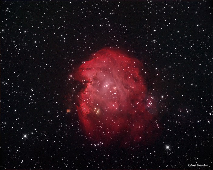 Auch für diesen Beitrag bleiben wir noch mal im Sternbild Orion. Bei dem sogenannten Affenkopfnebel (auch als NGC 2174 bekannt) handelt es sich um ein H-II-Emissionsnebel im oberen Bereich des Sternbild Orion, etwa 6400 Lichtjahre von der Erde entfernt. Sein Durchmesser beträgt 75 Lichtjahre und wird deshalb Affenkopfnebel genannt, weil er mit etwas Fantasie dem Kopf eines Makaken ähnlich sieht.